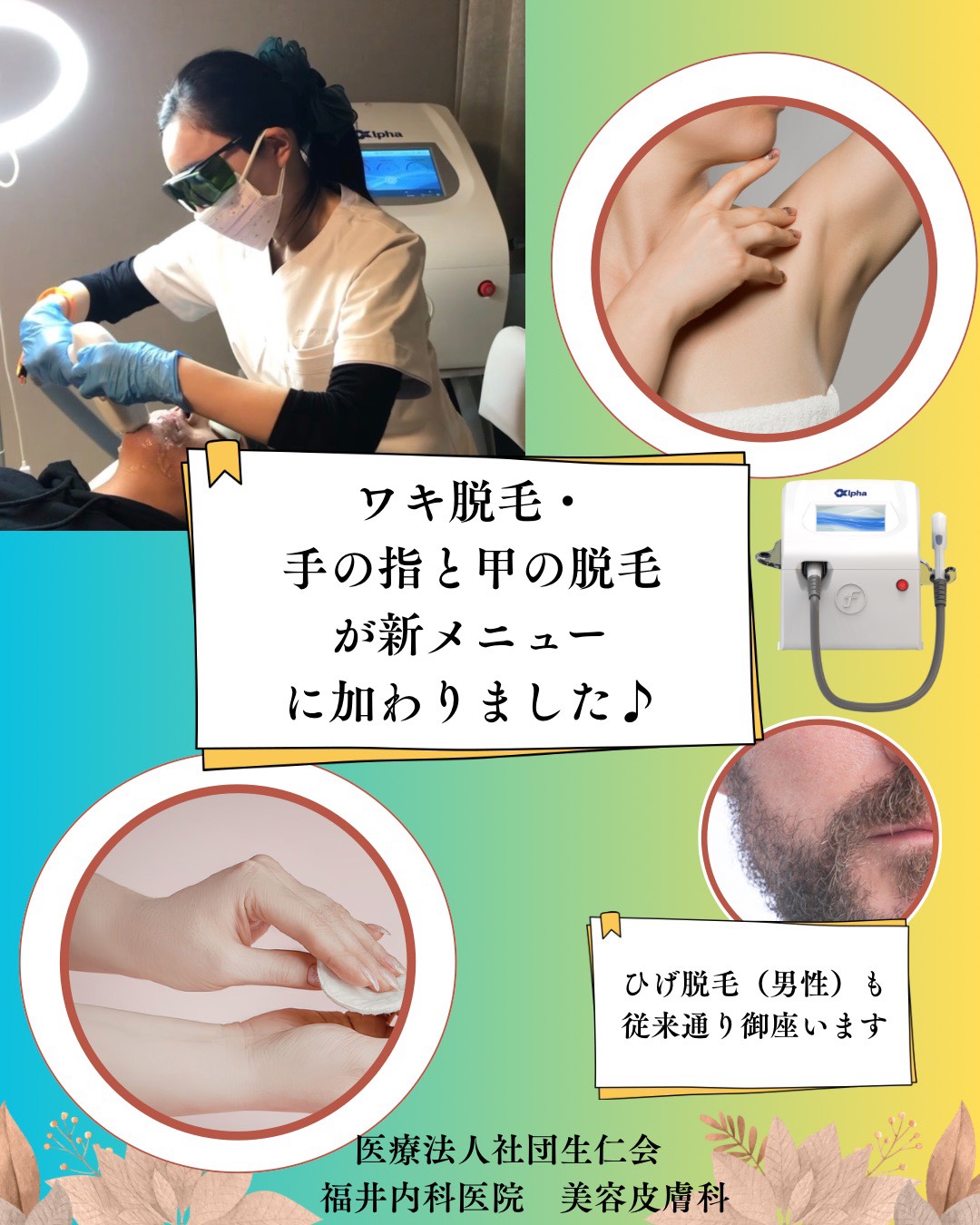 福井内科医院に、美容皮膚科を開設してから4年が経過しようとしています。当初は、男性のひげ脱毛のみを行なっていましたが、約4年間で、上記部位のお問い合わせが多く、メニュー化に至りました。